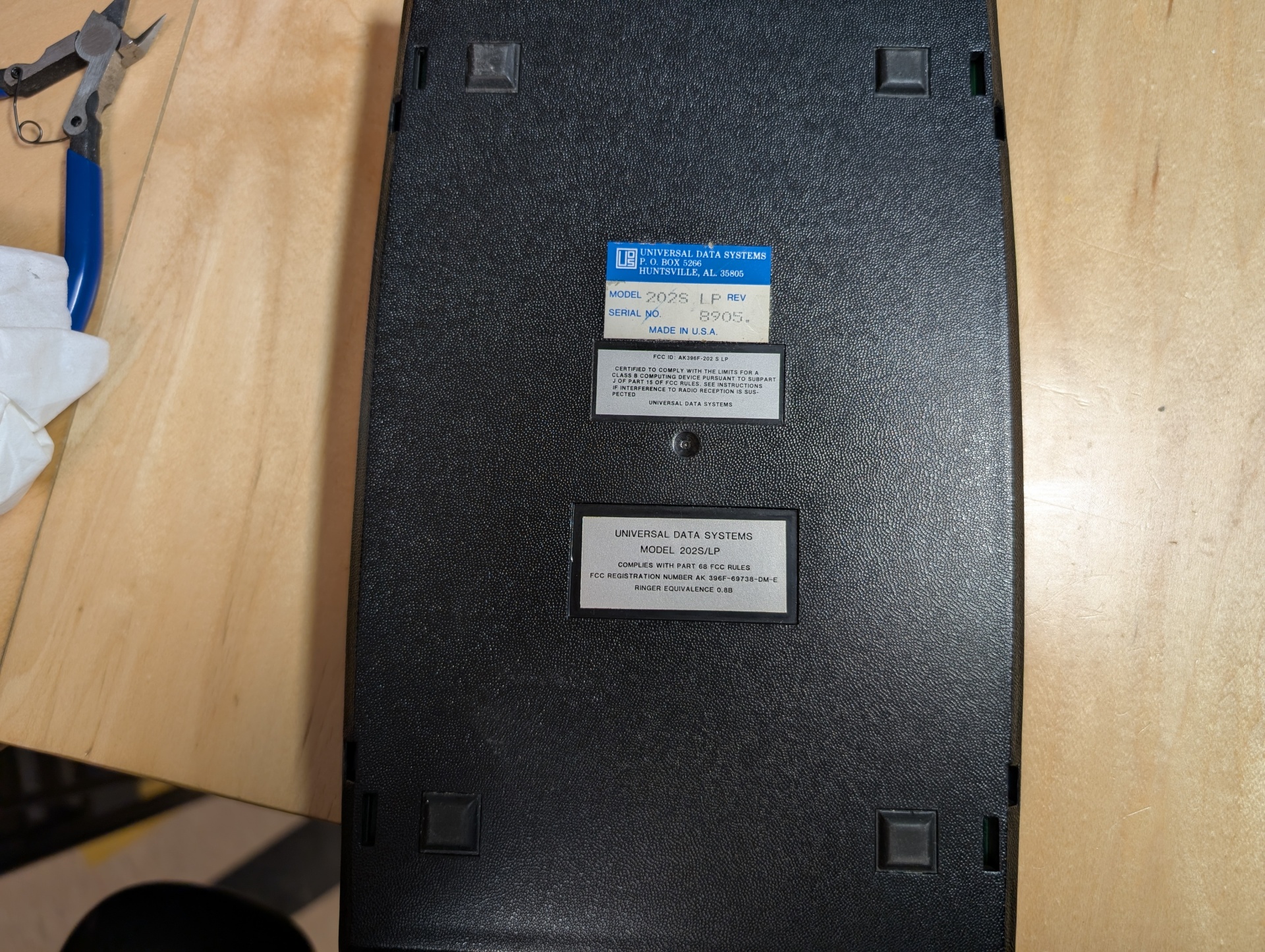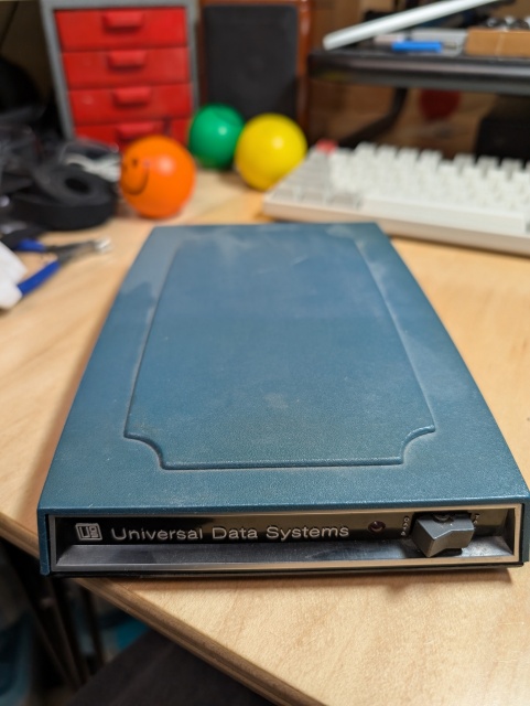 Now that I actually hold it in my hand and look at it, that Universal Data Systems box isn't a modem and now I need to look that up and figure out what that does. I was looking to see what type of power connector it has and found it doesn't have one and so whatever it does is totally passive or powered from line power from the serial port? There's two "maybe actual rj-11 jacks" on the back, one labeled TELCO and the other TELSET and a 25 pin female serial port labeled DTE.