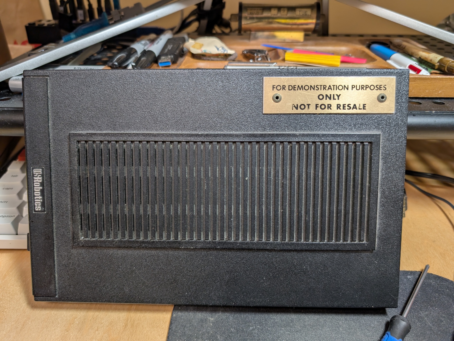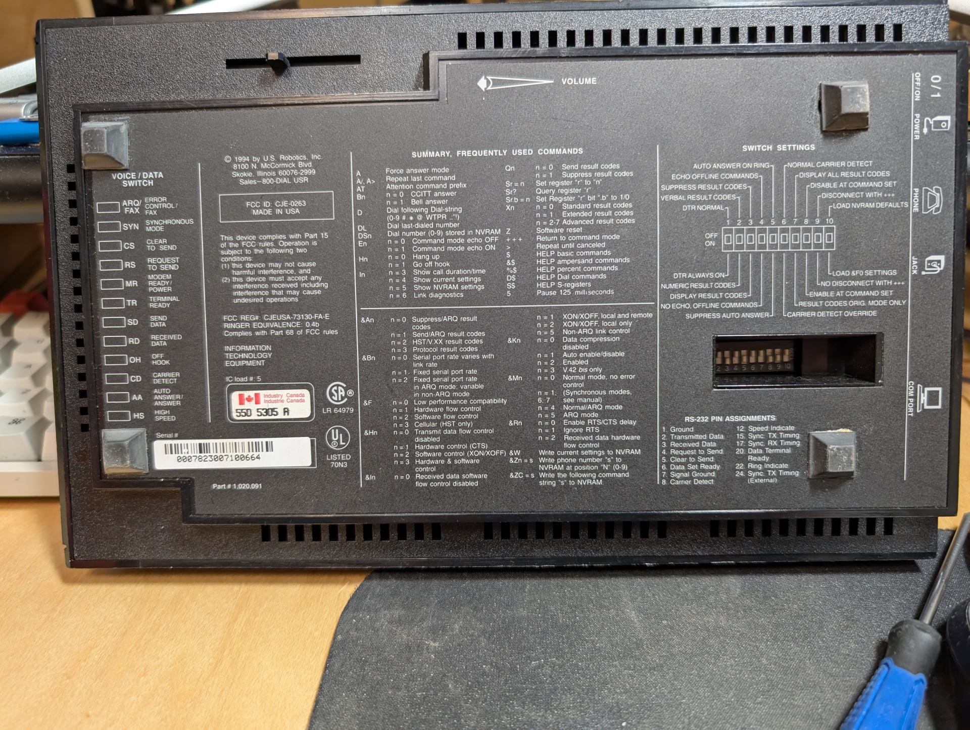 I'm wondering if I shouldn't have a bench power supply for this, but I have a couple of USRobotics modems and the power supplies are way different, like I think one is 19V something. I guess I just have to try them both on the smaller one and hope for the best? Neither one has any external indicator of what voltage they want even though the courier has a full printed summary of all the AT commands and detailed DIP switch settings. All of which is helpful, but how the fuck many Juice do you want coming in this hole right here? Center positive, presumably?