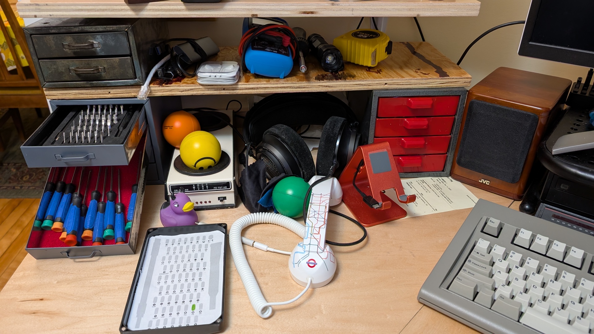 This is the desk I sat at for the last 5 years of my job and for two days a week for a decade before that. To be honest it feels weird for the job to be gone and for me to still be allowed in here. This is likely the last photo that will have my work laptop running Gibson in it. I am currently running through every bin and every parts drawer and converting my entire life over from full time network and server admin to ... someone who just hangs out and does projects and upgrades and documentation for a while.