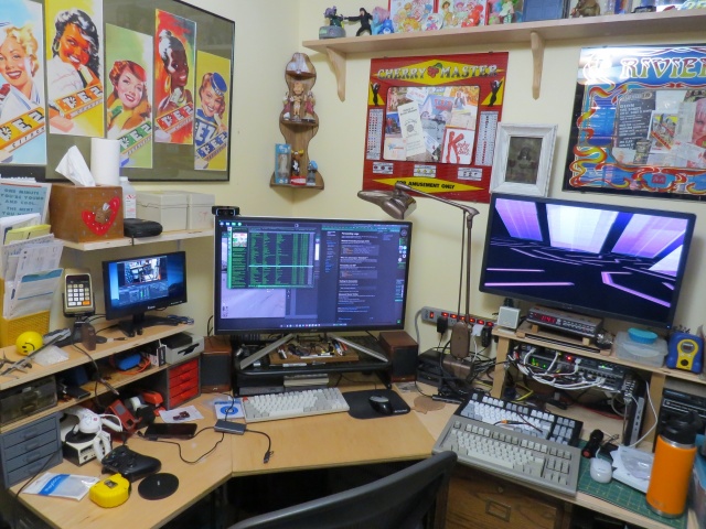 This is the desk I sat at for the last 5 years of my job and for two days a week for a decade before that. To be honest it feels weird for the job to be gone and for me to still be allowed in here. This is likely the last photo that will have my work laptop running Gibson in it. I am currently running through every bin and every parts drawer and converting my entire life over from full time network and server admin to ... someone who just hangs out and does projects and upgrades and documentation for a while.