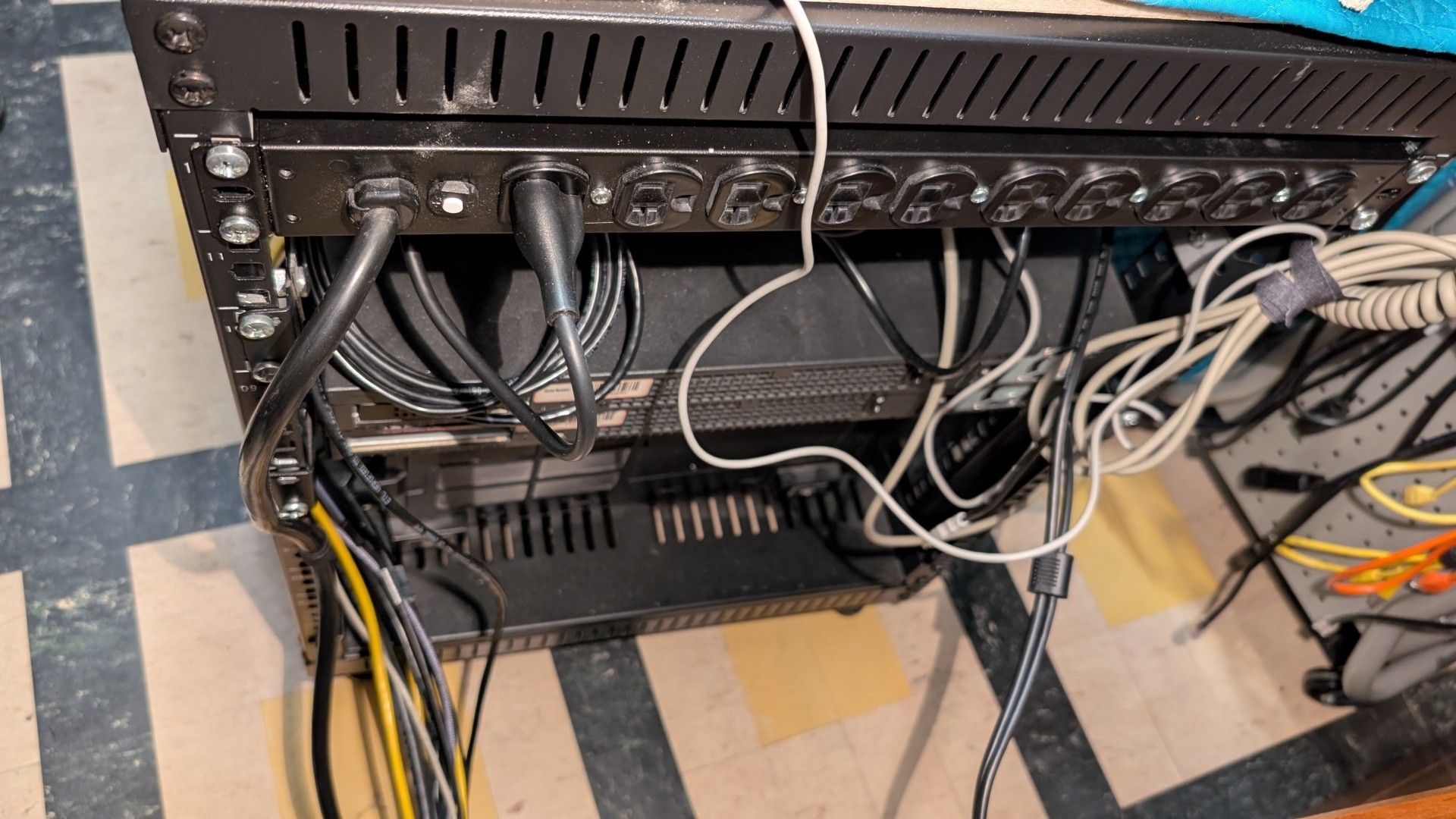 That bin in there has one of every analog A/V cable, adapter and dingus. There are lots of angled and shorter cables coming to clean that up more. The black thing is the NeXT station breakout box for VGA, sound & keyboard. The VGA cable on the left is for stuff I want to plop down and work on like a 1u server or a PC or laptop. I have two P4 PCs that I've never even powered up because doing so would be a hassle, well Hassle No More! I have a bunch of rackmount stuff to build to replace this unstable webserver. I'm going to start with one and work my way up to two servers splitting the load here.
